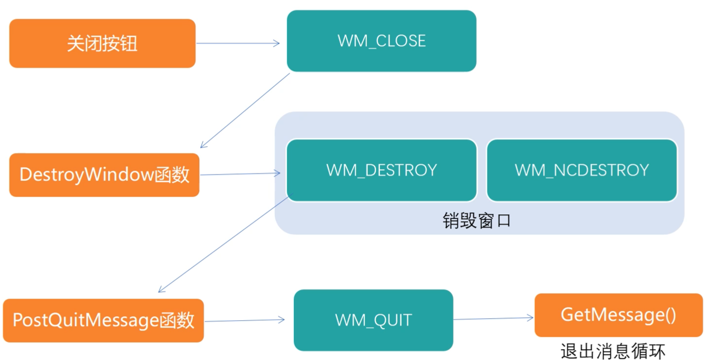 通常在这个消息中进行资源清理操作,如释放内存,关闭句柄等等。最后发送WM_QUIT消息。